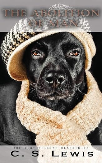 Yes, this is a real cover. No, I have no idea what a dog wearing a scarf and hat has to do with The Abolition of Man. But even now, this is the cover when you look at the hardcover version of the book on Amazon. Woof.