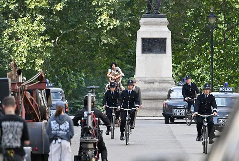 Filming took place in the heart of London, including around the Robert Clive statue in Whitehall and through to Westminster, we’re told. There were over 100 extras used throughout the filming sections, and even some four-legged canine friends joined in the action. Some of the action involved the police on their bicycles crashing into a Royal Marines band service.