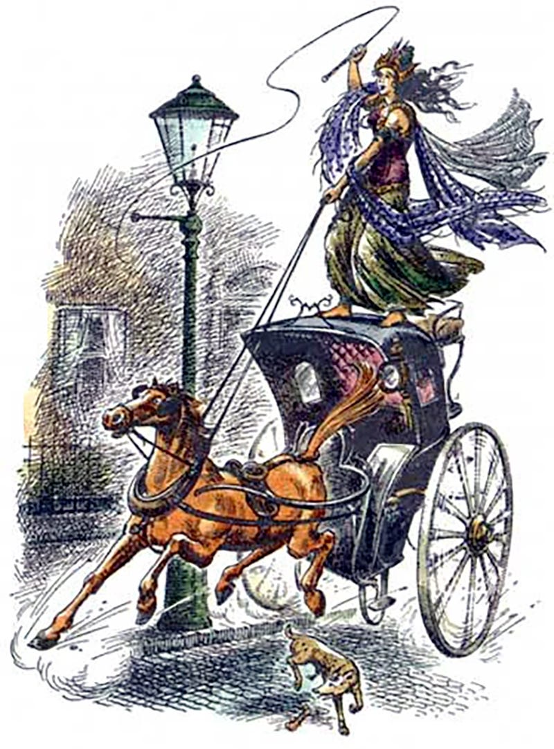 Jadis is undoubtedly an evil character, but, at least in this chapter, she’s also a comical one.1 Aunt Letty sees her unusual height and scandalous bare arms and assumes she must be from the circus. She calls her a “shameless hussy” and a “drunk.”2