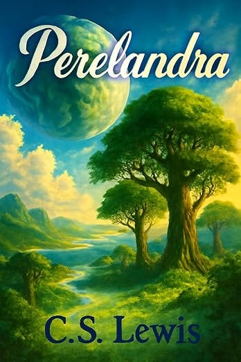 I have no idea what’s happening in this obviously AI-generated cover, but it has no connection to what happens in Perelandra, other than green being a very prominent color.
