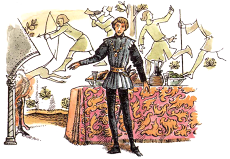We begin with the Black Knight1 serving our traveling trio a meal and telling them what he can remember of his story, his current circumstances, and their future plans.