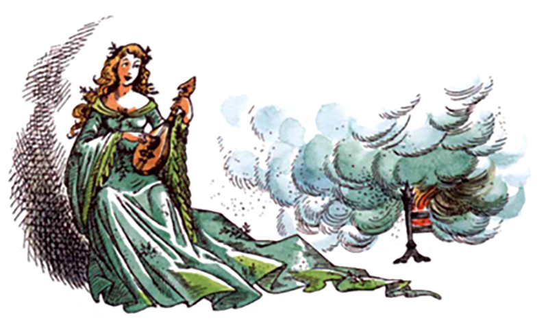 Rilian says he wants to return to Narnia with the other three. Instead of responding, the Queen tosses a handful of green powder into the fireplace, filling the room with a “very sweet and drowsy smell” that grows stronger and makes it harder to think. She also takes out a stringed instrument and begins a “steady, monotonous thrumming” that “got into your brain and your blood.”1