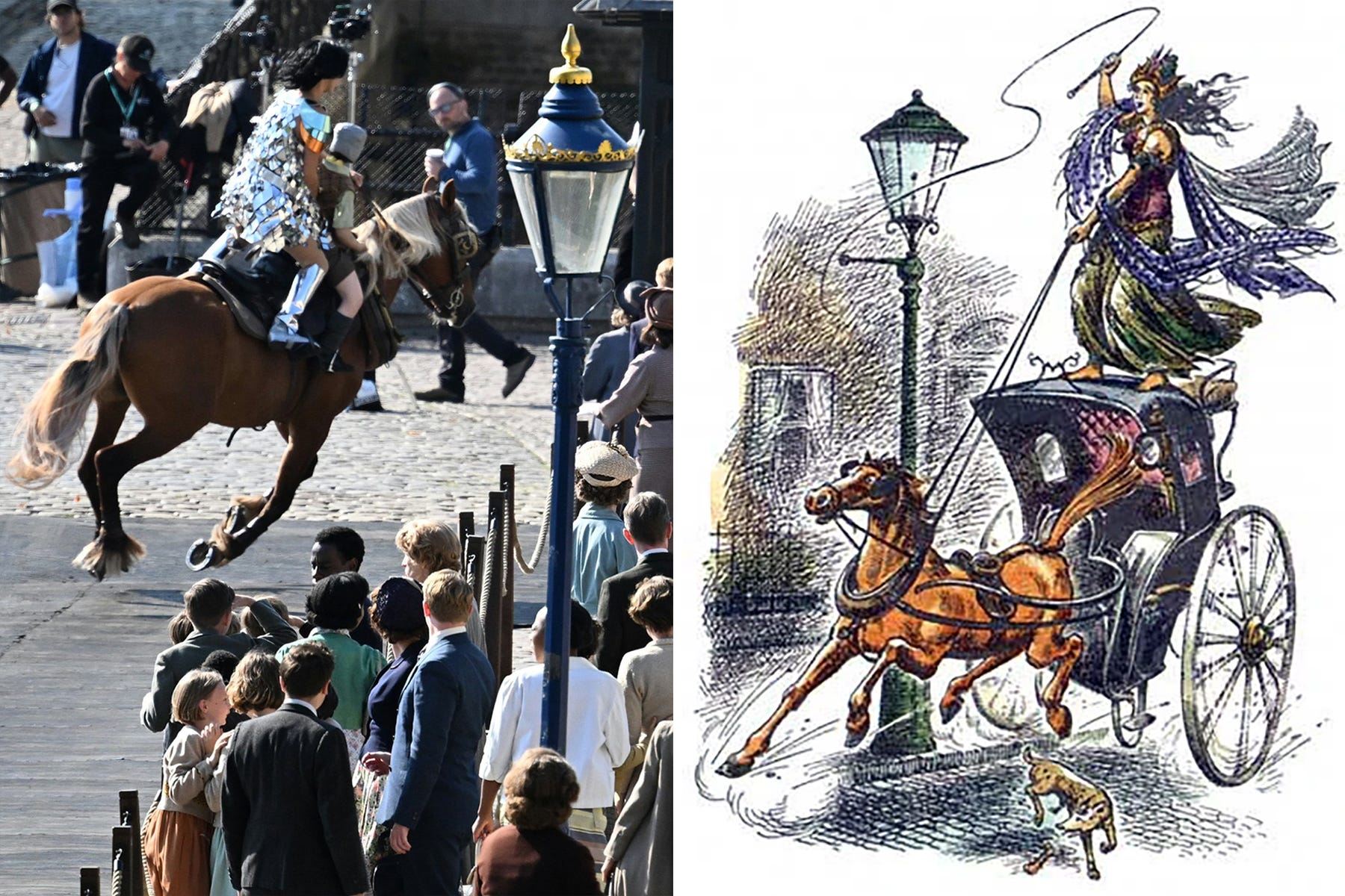 The latest batch of images seem to be from the moment in The Magician’s Nephew when Digory and Polly accidentally bring Jadis to London. She goes rampaging through the streets before they transport her back to the Wood Between the Worlds. This eventually leads to Jadis, the two kids, Uncle Andrew, Frank the cabby, and his horse Strawberry arriving as Aslan creates Narnia.